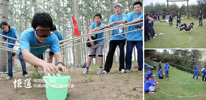 全队人分成两组在看不到的情况下用不同长度的两根绳子,搭建一所房子。