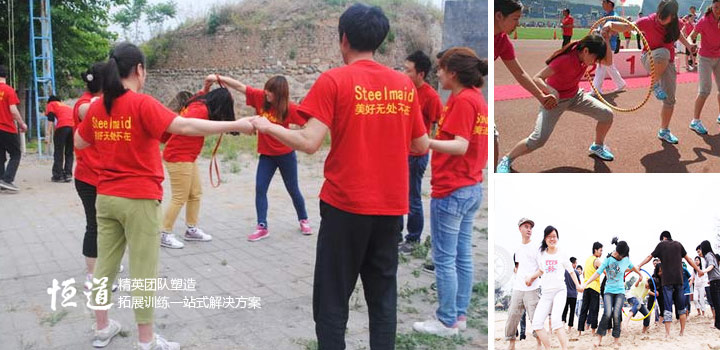 所有学员手拉手围成一圈,用绳圈穿过所有人的身体回到原位。在活动过程中,不能以语言为沟通工具,只能依靠肢体语言和眼神进行沟通,相互拉着的手不能放开,也不能用手指去勾绳圈。计时,看最快用了多少时间完成。